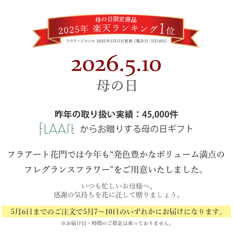 ※母の日期間中は、全国的にご注文が増え、配送業者も荷物が混雑し、お届けの遅延が発生する場合がございます。そのためこの期間中は、配達日時指定を受け付けておりません。何卒ご理解のほどよろしくお願いいたします。