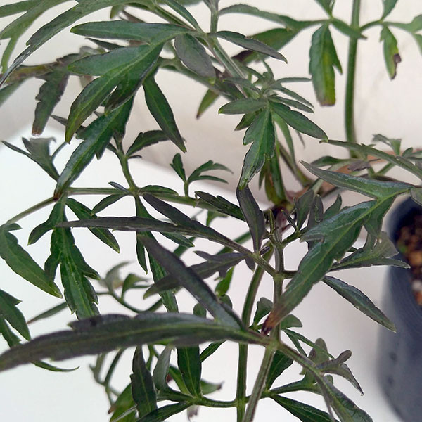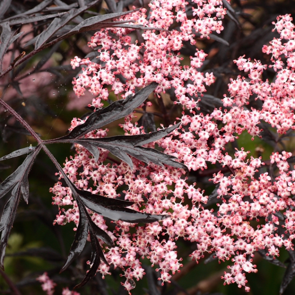 西洋ニワトコはエルダーベリーとも呼ばれ、欧米では昔から人気のある庭園樹兼果樹です。ブラックレースはチョコレート色の葉がアメリカで大人気となっている観賞用品種。深い切れ込みの入る葉は繊細な風情で、どこか日本のもみじに似た雰囲気もあります。春にはソフトピンクの小さな花をたくさん咲かせ、葉色と非常に美しいコントラストを描きます。花のあとには赤黒色の実がつき、収穫すればジャムや果実酒に利用できます。あるいは、そのまま木に残せば小鳥たちの餌ともなります。非常に耐寒性が強く、マイナス35度まで耐えます。また栽培も楽です。日向〜半日陰で栽培できますが、春に日当たりのよい場所のほうが葉色がきれいに出ます。花壇や植栽のアクセントとして、あるいはまとめ植えして印象的な風景や垣根を作るのにも適しています。あるいは、宿根草花壇の中に植えてもすてきです。剪定しなければ2.5mほどになりますが、毎年落葉後に剪定して好みの樹形を保つこともできます。