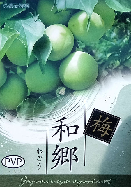 和郷は「剣先」に育成系統の「MM-43-22」を交雑させて育成された品種。自家和合性で結実が安定したウメの新品種です。受粉樹が不要で1本でも育てられます。果実の大きさに対して核が小さく果肉が多いのが特徴で、果形は短楕円形、30g以上の大果となります。花は白色の一重咲きで開花盛期はやや遅く3月中旬頃で「白加賀」など開花期が遅い品種の受粉樹としても期待されています。