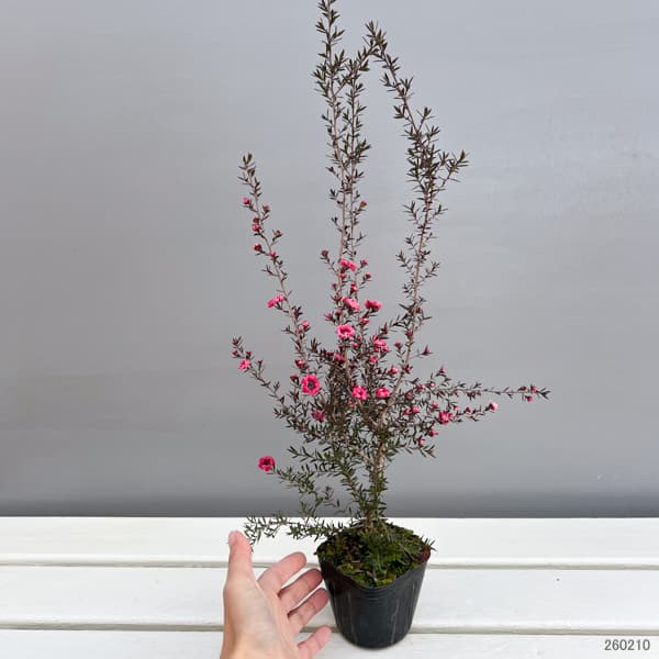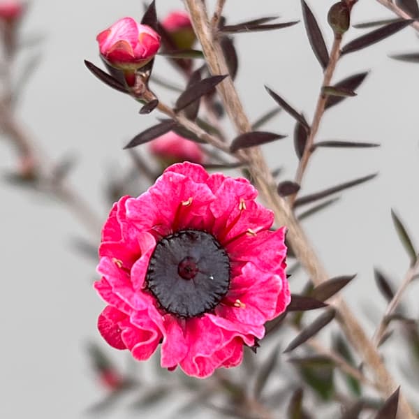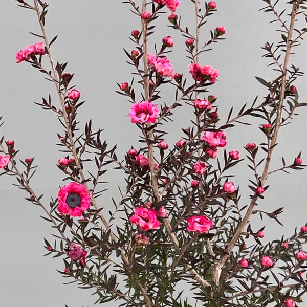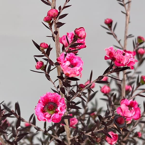 秋から春先にかけて、長く花を咲かせるギョリュウバイ。ニュージーランド原産のティーツリーの仲間です。樹高1〜4mになる、変異に富んだ常緑低木です。梅の花に似た花を冬から春にかけて開花させます。耐寒性はマイナス7度まで。この品種は濃桃花の八重咲きです。