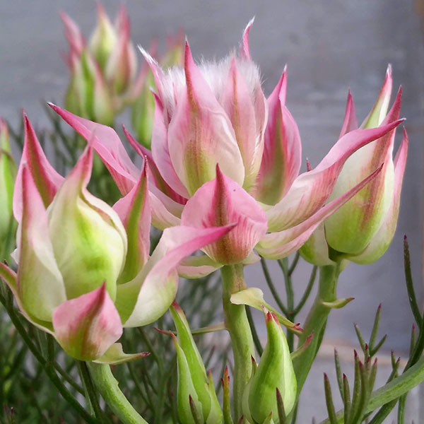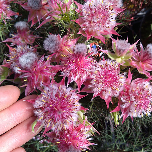 南アフリカ原産の常緑低木でネイティブプランツとして人気のセルリア。枝の先端に多数の花が集まって咲き、色づいた総苞が美しくそれを取り囲む独特の花がとてもきれいです。カルメンはオーストラリアで品種改良された最新品種。花は小ぶりですが、花付きが良く濃いピンクの花色で節間が短くコンパクトにまとまります。花持ちがよく切花として注目され、フラワーアレンジメントでは大人気の品種です。またドライフラワーにも適しています。