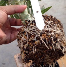 対し「硬い土」に植えた場合、根は鉢の底まで行かずとも、途中何度も硬い土にぶつかり、分岐を試みます。要は「やわらかい土」の場合、根が鉢底に集中するのに対し、「硬い土」は写真のようにいたるところで根が分岐。鉢全体に根が行き渡るのです。