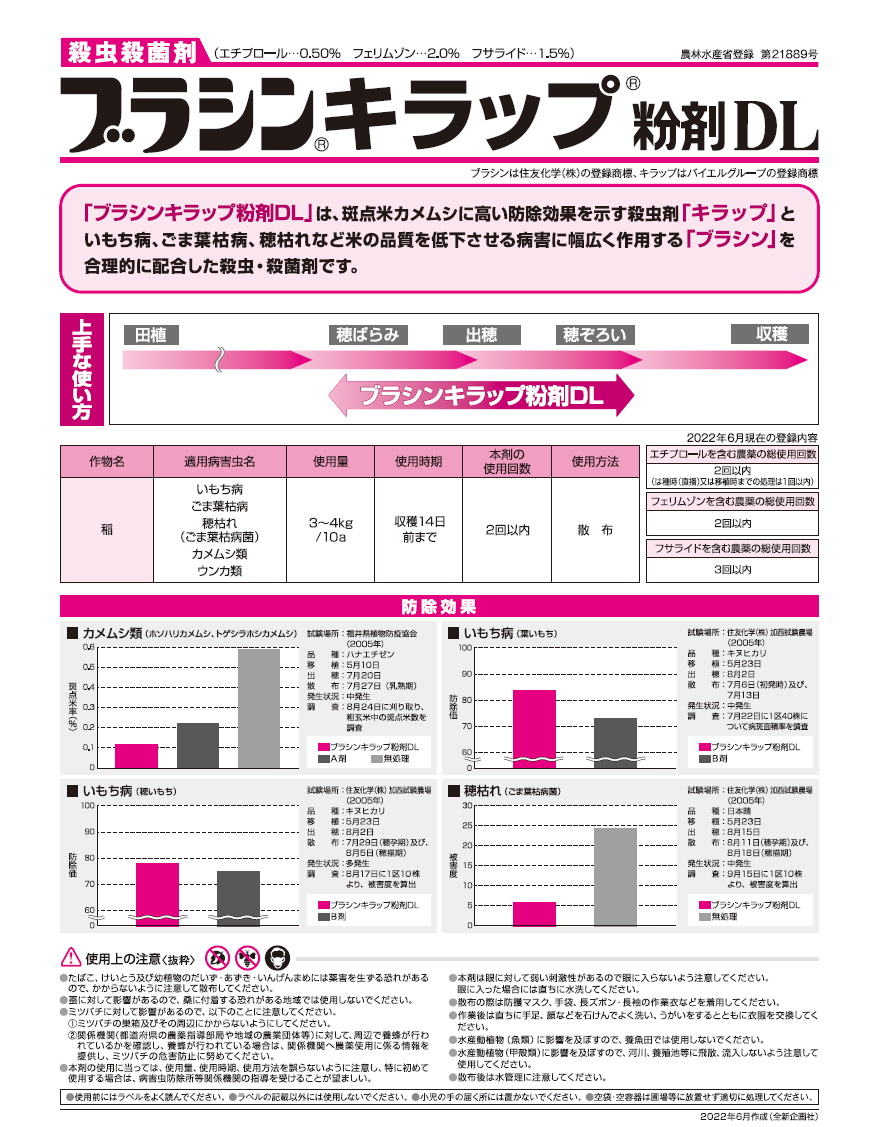 ●いもち病をはじめ穂枯れに効果のあるブラシン剤と、殺虫剤のキラップの混合粉剤。