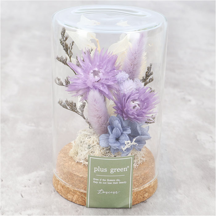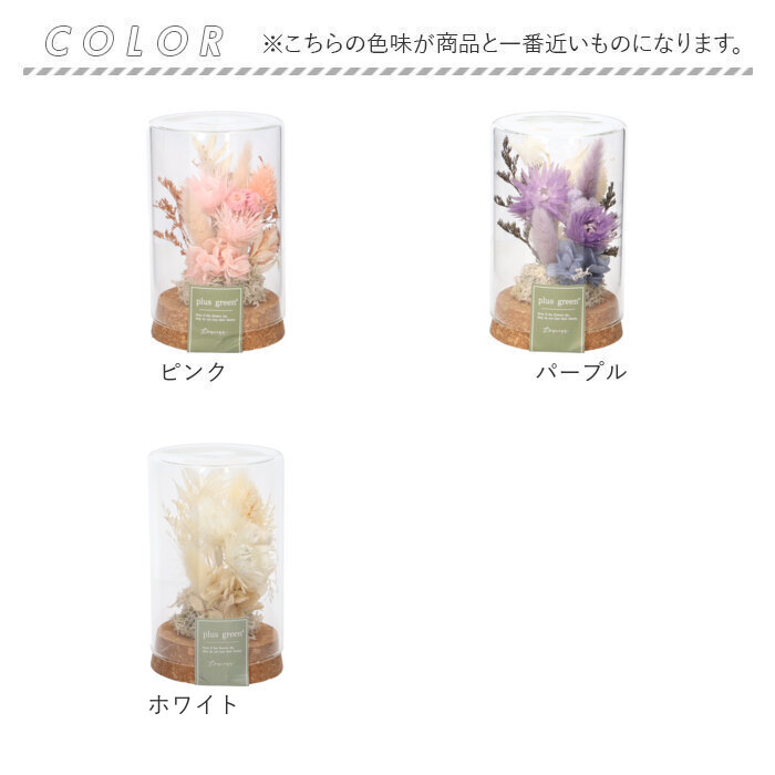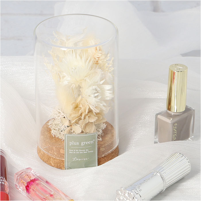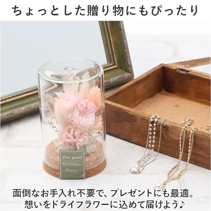 ・ガラスボトルでカバーできるから、ドライフラワーをキレイな状態でキープ。水やりも必要なく、お手入れはボトルをサッと拭き取るだけ。