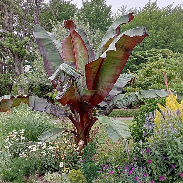エンセテ・ヴェントリコスムはエピオチア(アビシニア)高原特産で、アビシニアバショウやエンセテバナナとも呼ばれます。葉裏の中筋が赤くなるのが特徴ですが、マウレリーは葉裏全体が赤みを帯び、より観賞価値が高い品種です。草丈は12mにもなる大型の草本で、葉の長さ5m、幅1.3mにもなります。現地では茎からデンプンを採り、パンやダンゴを作ります。耐寒性があり、マイナス3度程度の低温に耐えます。