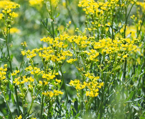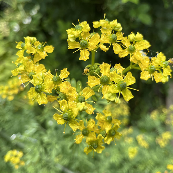 香りのよい常緑多年草です。昔は薬草として利用されましたが、現在は園芸用に庭植えにされます。独特の香りは虫除け(ハエや害虫を防ぐ)の効果があると言われています。小さな黄色の花が集まって咲き、さわやかな印象です。ヨーロッパではその後にできる実を摘み取って財布に入れておくとお金がたまる、といわれています。
