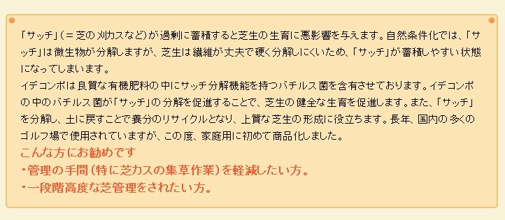 芝生愛好者の中では「イデコンポは散布するだけでサッチを分解し、芝生の栄養成分もとれる」と定評があり、隠れた人気商品となっています。