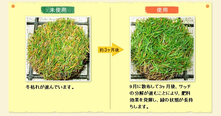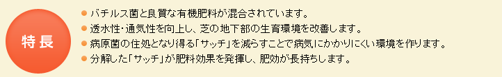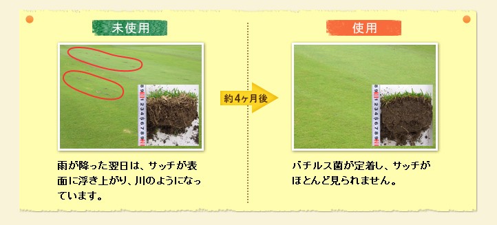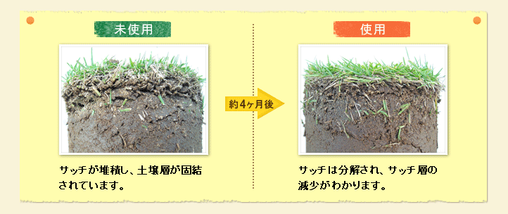 微生物の働きによりサッチの分解を促進し、芝生の生育環境を改善することで、健全な芝生の育成に効果を発揮します。