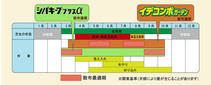 芝を刈った後に散布する場合は、刈りカスをある程度取り除いていただき、イデコンポガーデンEVをパラパラと撒いてください。