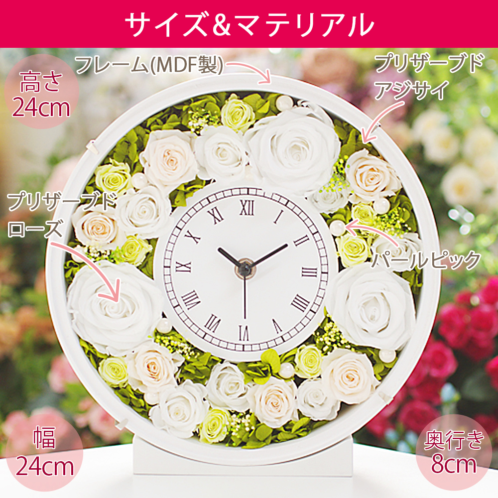 プリザーブドローズ、アジサイ、カスミ草、パールピック、時計(木製(MDF)/表面にガラスカバー)、電池(動作確認用)