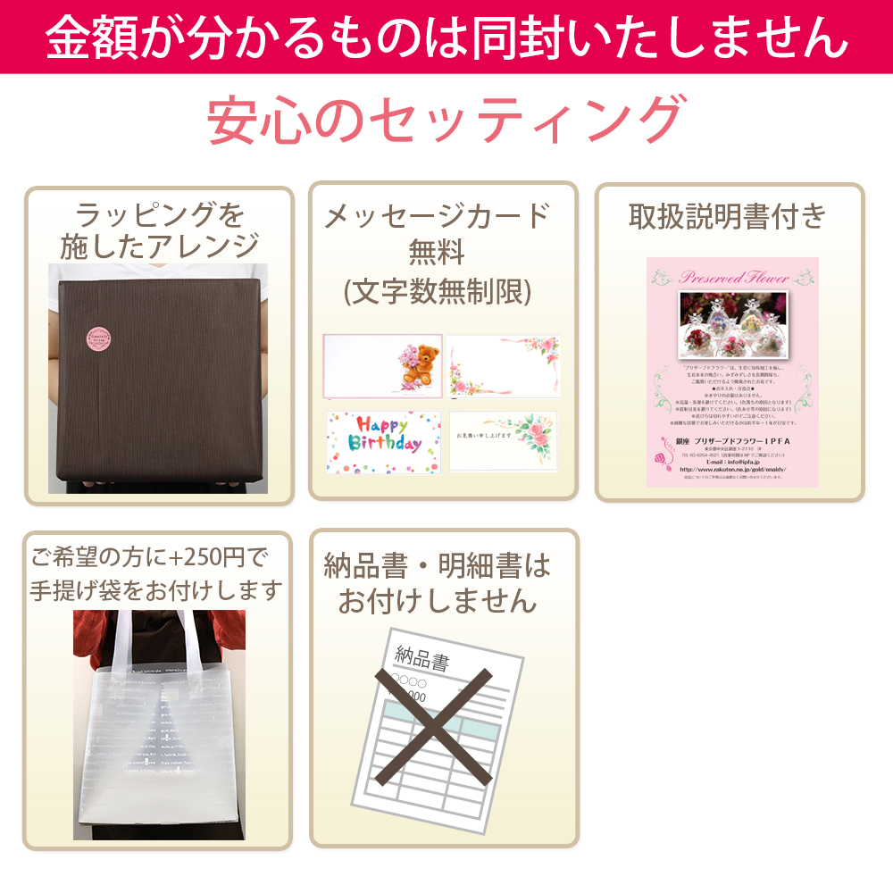 (ギフト仕様でお送りするため納品書、明細書、領収書、広告類等の金額が分かるものは一切同封いたしません。ご購入モールの表記も行っておりませんので安心してご利用くださいませ)