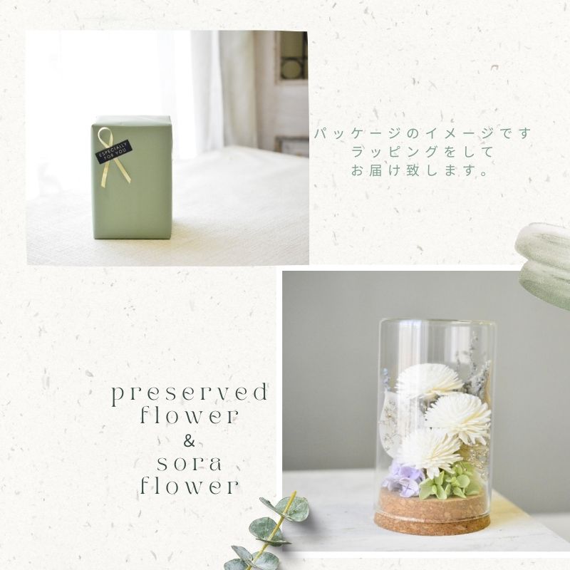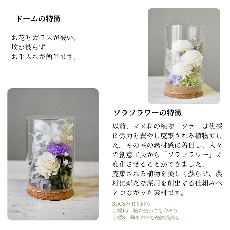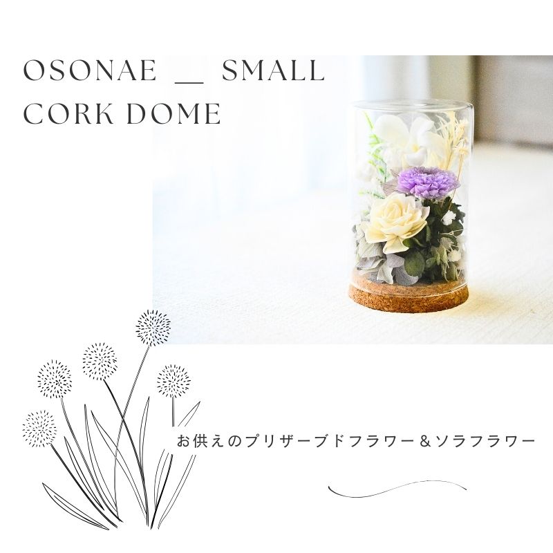 プリザーブドフラワーとソラフラワーでお作りしています。ガラスとコルクのドームに守られたお供え花です。