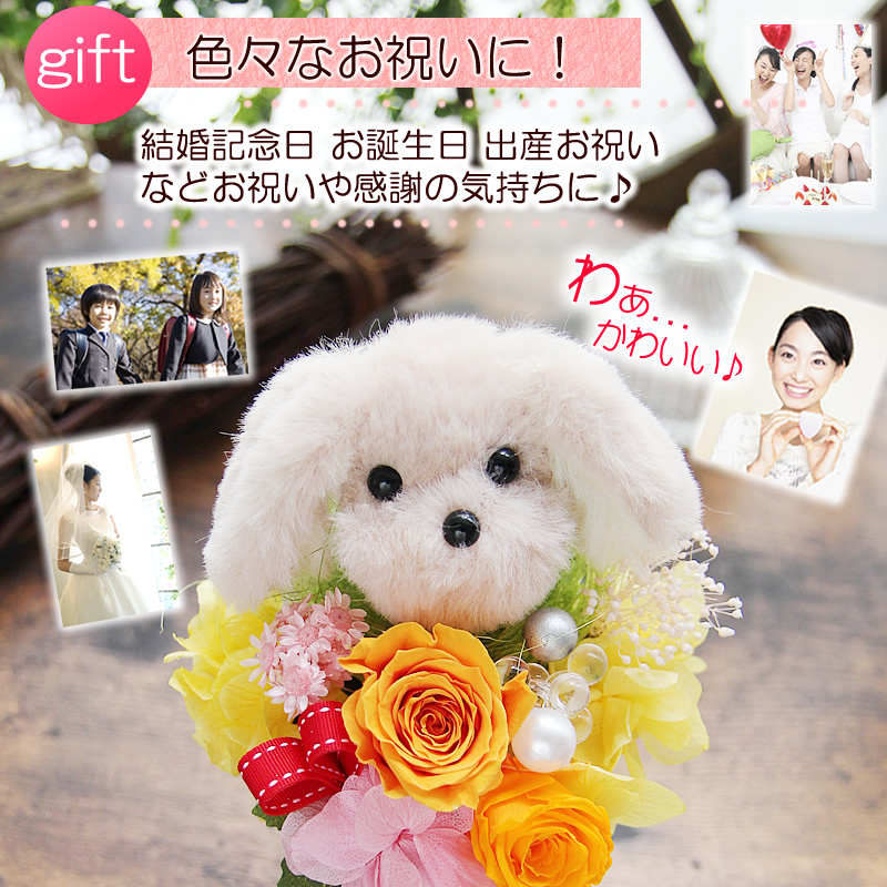 プリザーブドフラワー 花 ギフト プレゼント ふわふわ わんちゃん ポムリ 誕生日 犬 お礼 お見舞い 退職祝い