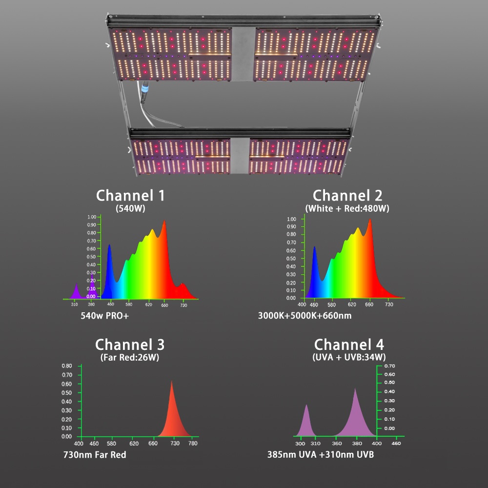 ダブルドライバー新デザインのおかげで、プロ+シリーズのスペクトルは4チャネル(全開、Lm301h+red、far-red、UV-A+UV-B)で変換可能となります。4チャネルをそれぞれに合わせて、およそ7パターンのスペクトルを演じれる、「自分流」のグロウライト設置は随分お楽しみましょう!
