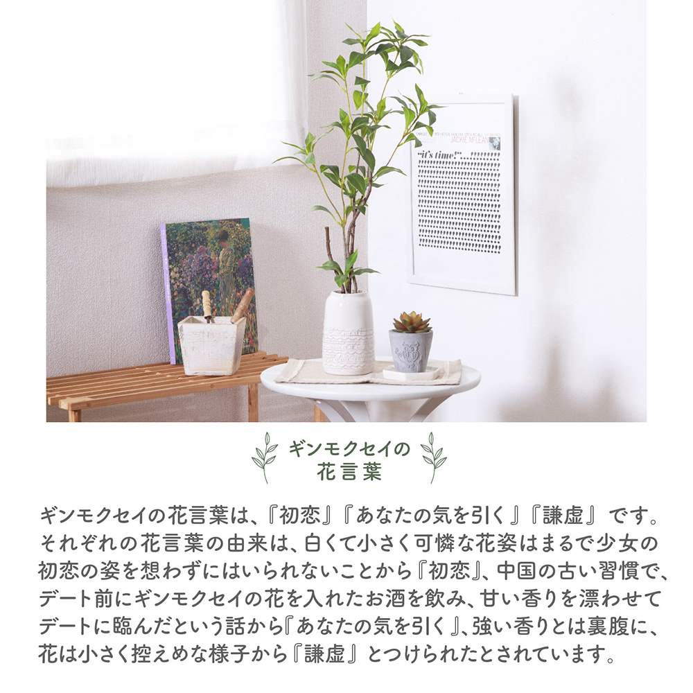 ギンモクセイのやさしい葉の色合いと、洗練されたセラミックポットが空間を爽やかに演出します。