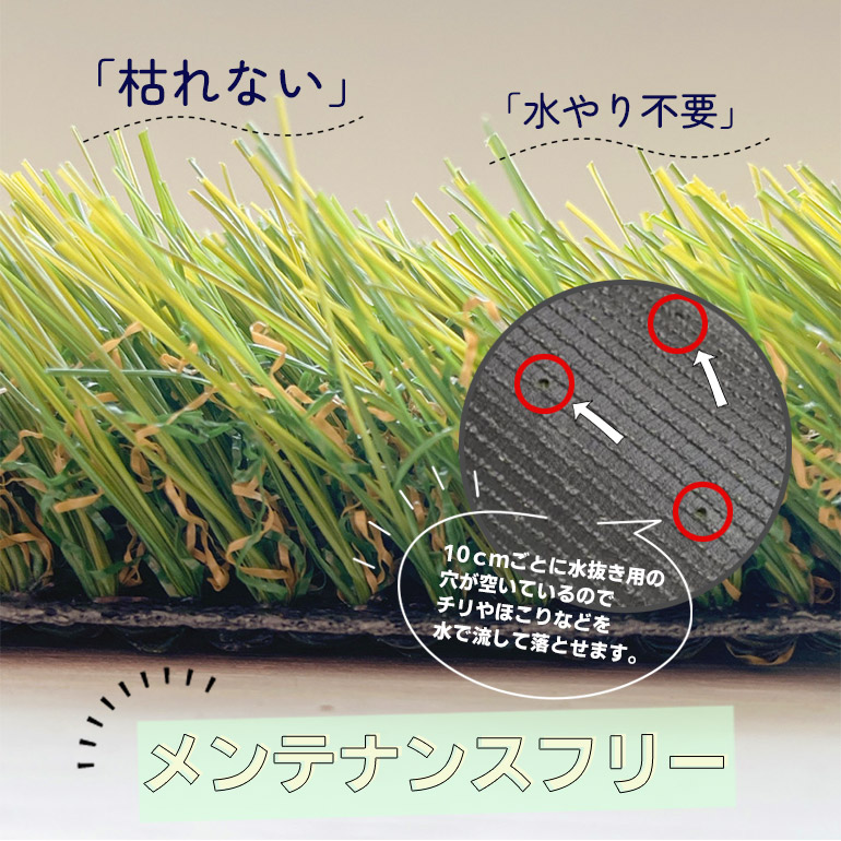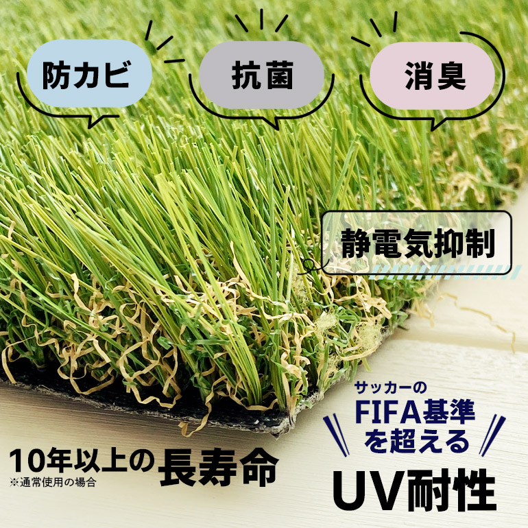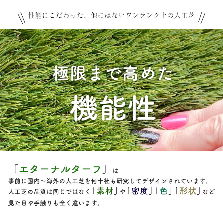 天然芝よりも人工芝は長持ちします。その中でも特に長持ちする加工を施し、色落ちしにくい仕様で製作されたこの人工芝にぴったりの名前となっております。