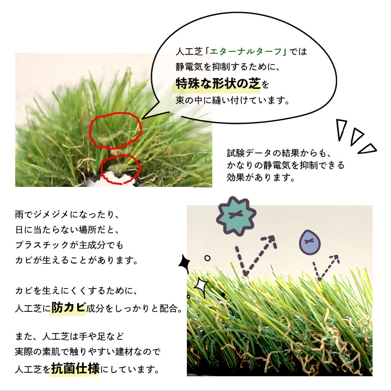 静電気抑制仕様にすることで、今まで悩んでいた人工芝の静電気にも解決できるようになります。