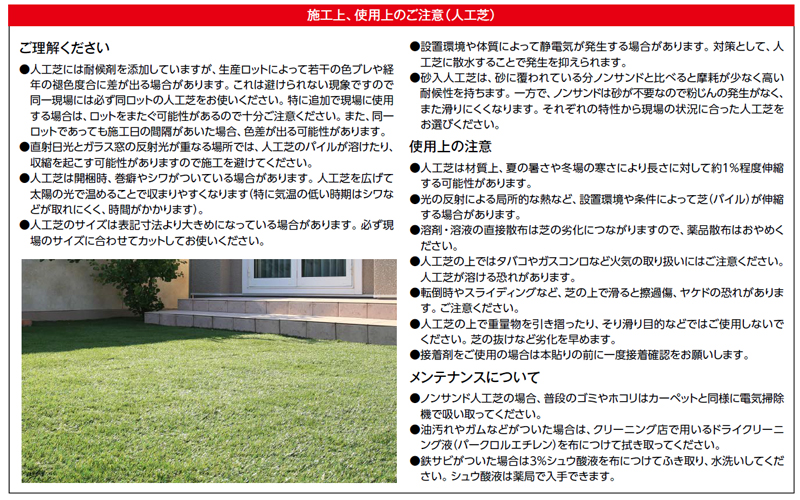 ●光の反射による局所的な熱など、設置環境や条件によって芝(パイル)が伸縮する場合があります。
