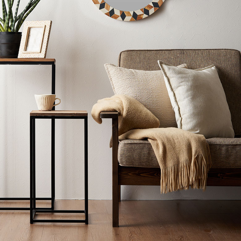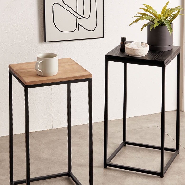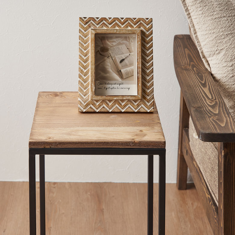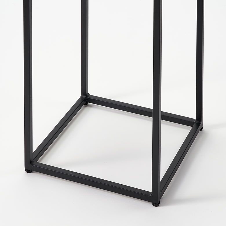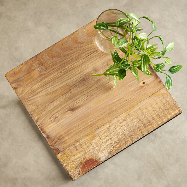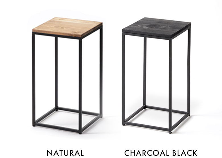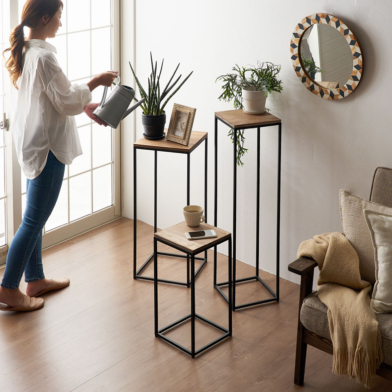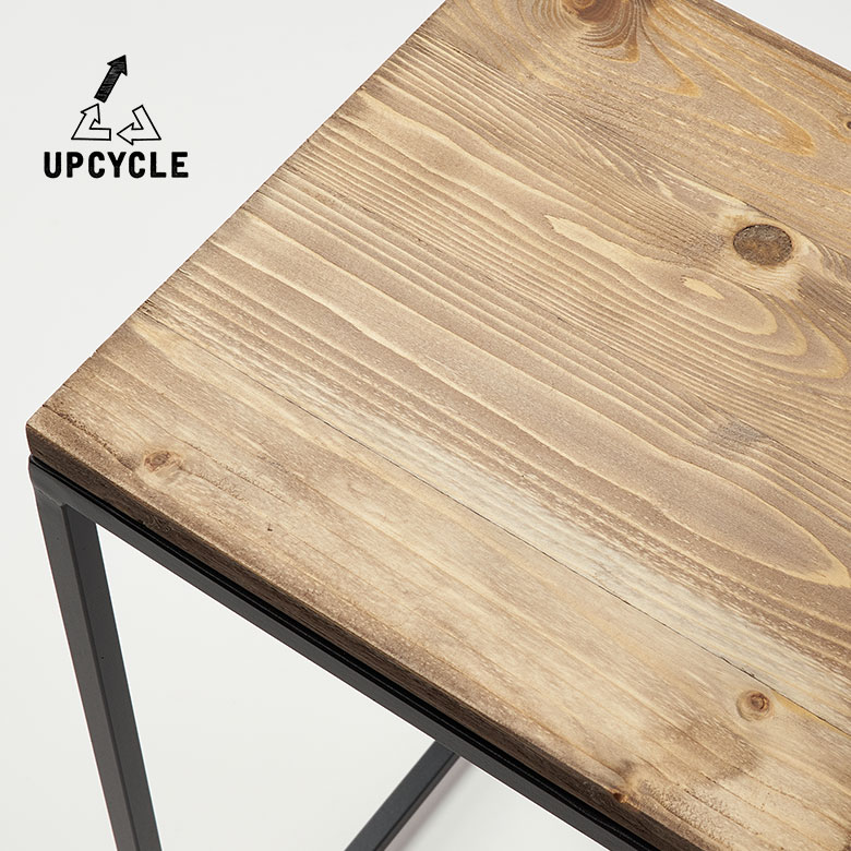 アップサイクルのパインウッド材とスリムなアイアンスタンドを組み合わせたスタイリッシュなデザインは、植物やオブジェを引き立て、空間をセンスよく演出。天板はあえて釘跡や傷を残し、ひとつひとつ異なる木目や風合いを味わえるのも魅力。アイアン部分にはパウダーコーティングを施し、耐久性とお手入れのしやすさを両立しています。