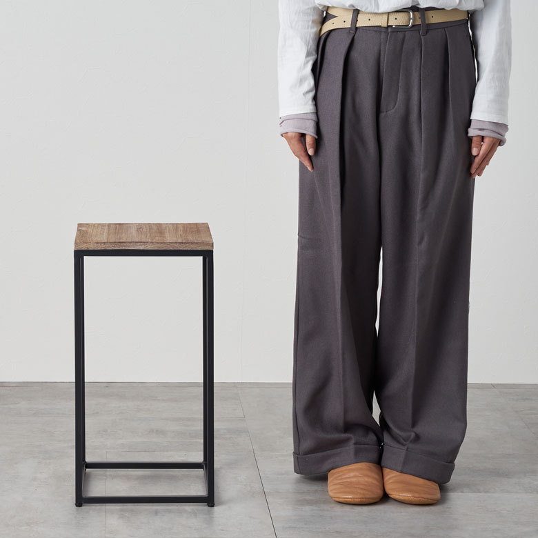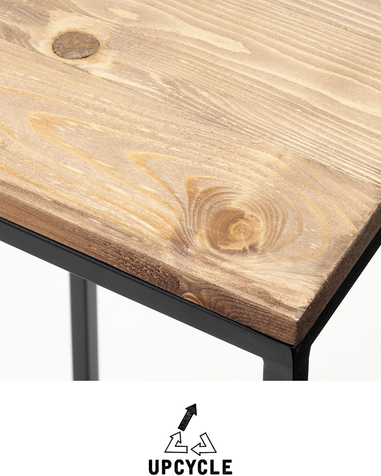 アップサイクルのパインウッド材の天板にスリムなアイアンスタンドを合わせたシンプルながらもスタイリッシュなデザイン。植物やオブジェを引き立て、空間をセンスよく演出。