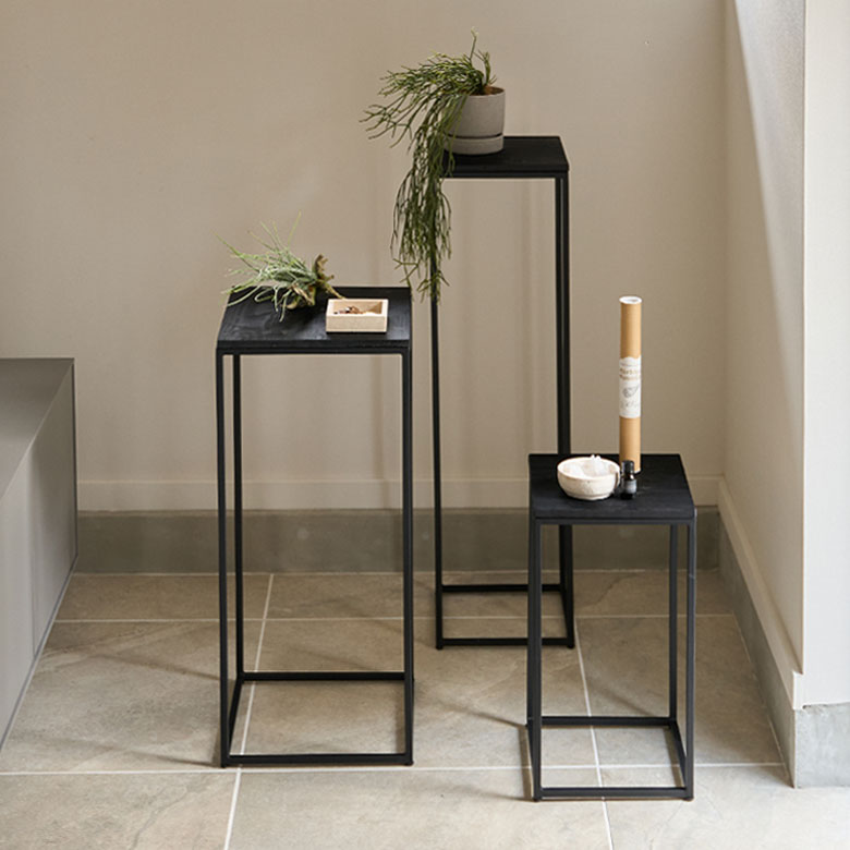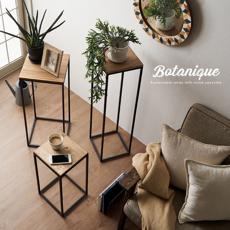 植物を飾るフラワースタンドとしてはもちろん、オブジェやフォトフレームを飾るディスプレイスタンドとしても活躍。モダン、ナチュラル、インダストリアル、リゾートなど多様なインテリアに溶け込む、センスアップアイテムです。同じリサイクルパイン材を使用した「ボタニーク」シリーズと合わせれば、統一感のある洗練された空間づくりが叶います。