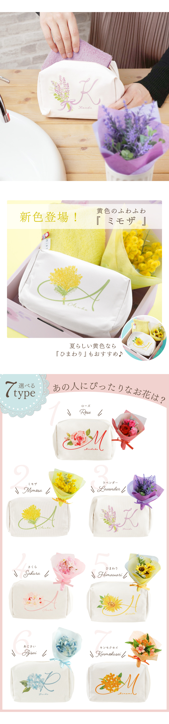 選べるお花とイニシャル、お名前を組み合わせた当店オリジナルデザインのポーチ♪