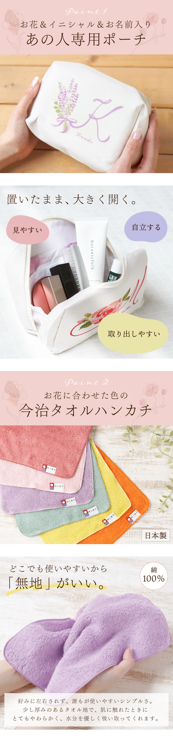 実用的な大容量ポーチ&安心の今治タオルハンカチ、