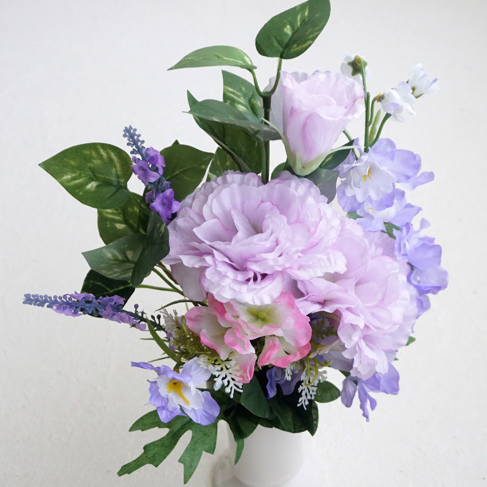 淡いラベンダーカラーのトルコキキョウがメインの小さめサイズの花束仏花。
