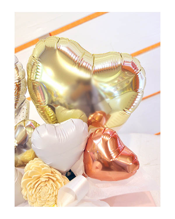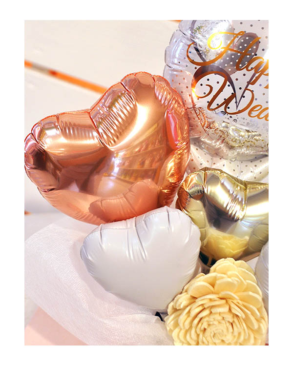 『HAPPY WEDDING』の文字がプリントされたメッセージバルーンやシャンパンカラーやローズゴールドなどの結婚式でも人気のカラーのハートのバルーンなど結婚式のお祝い用に可愛くでも上品で華やかなバルーンを使用しています。