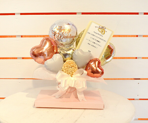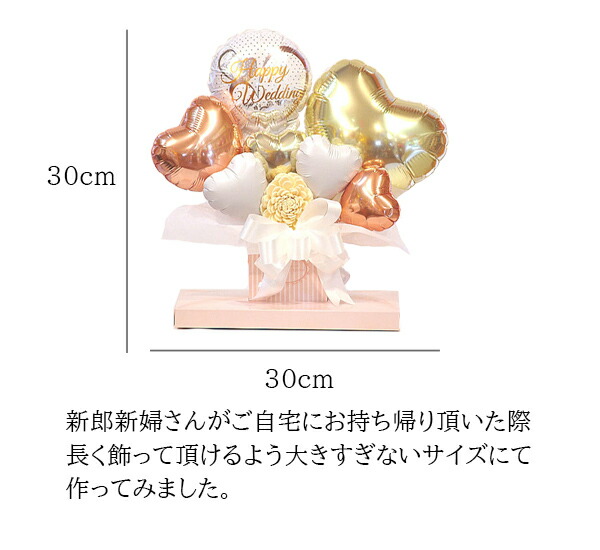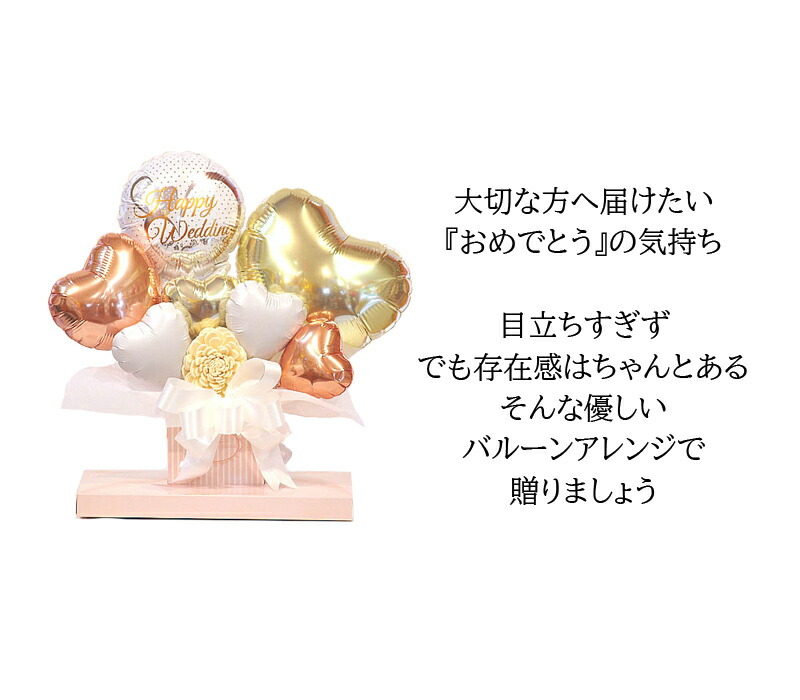 とにかく優しく結婚のお祝いを伝えたい気持ちを込めたバルーン電報アレンジです。縦横30cm×30cmで当店のアレンジの中では小さめ。それは荷物の多い新郎新婦に配慮し気持ちを伝えることをメインとしたためです。小さくとも存在感はばっちりで可愛く目立ってくれますよ。持ち帰り用の袋もつけてあります。枯れたり臭ったりせず長持ちがバルーンの良いところ。優しく気持ちを贈りましょう。