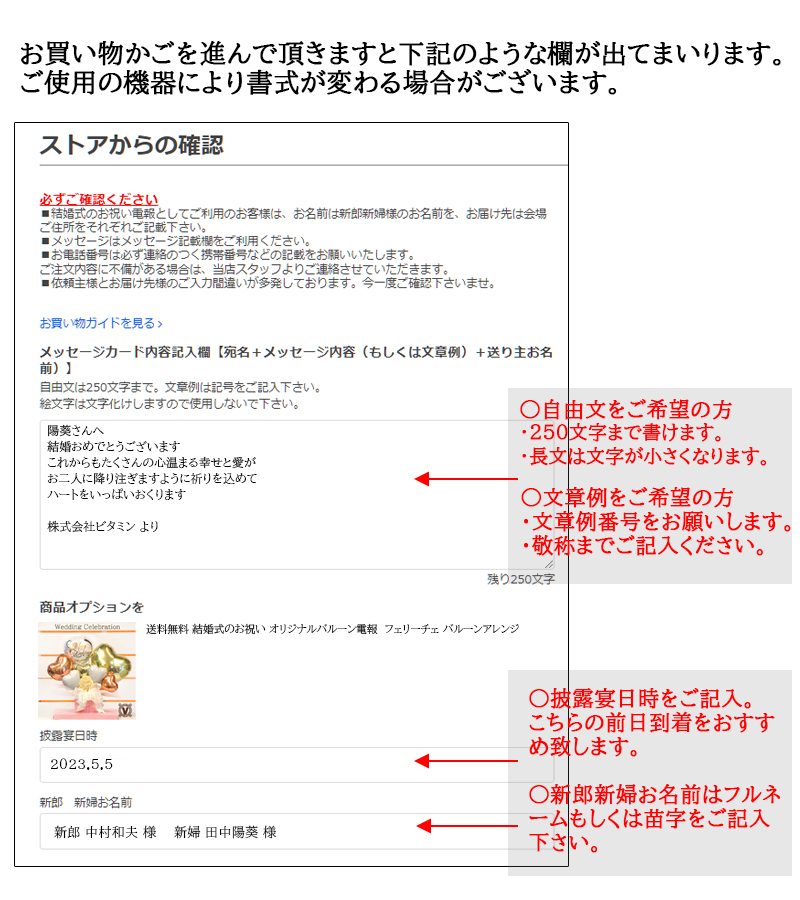 ・必ず披露宴会場名をご記入ください。新郎新婦のお名前のみの場合到着できないことがございます。