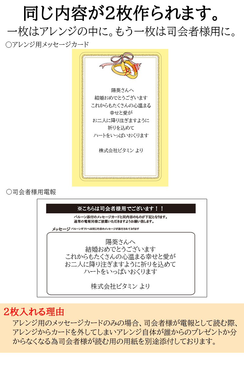 結婚式のお祝い電報におすすめ。ウェディングではとても喜んで頂けるおすすめの人気アレンジです。