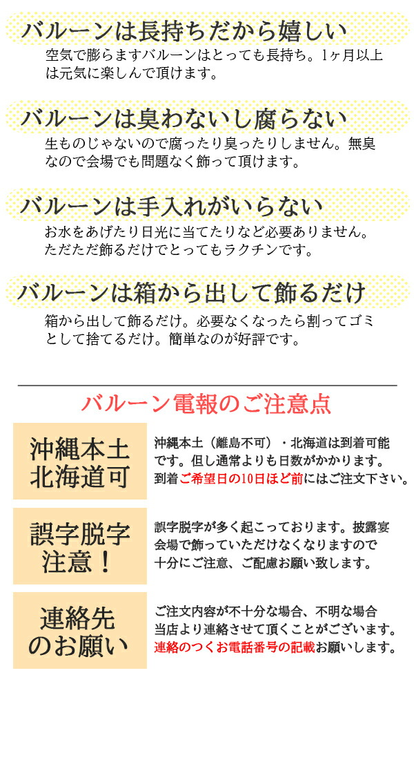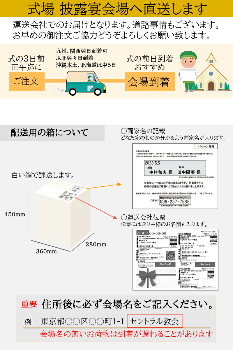 到着日時のご指定をお願い致します。大切な贈り物をご希望日時に到着させるためには、皆様のご協力が不可欠です。バルーンは膨らまして後、点検作業が必要になります為、ご使用日3日前までのご注文をお奨め致します。